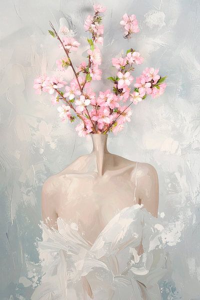 Une œuvre à l'huile, en blanc et en couleurs claires atténuées, d'une femme gracieuse portant une robe blanche en voile sexy. Les branches de fleurs roses ont envahi son esprit, sa tête n'est pas visible pendant un moment, juste du rose doux et des pensées, mystérieuses et paisibles. L'image a été générée en utilisant ai.