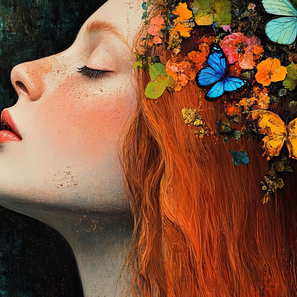 Femme fleurie - Couronne de papillons - Ce tableau de femme représente une femme de profil, les yeux fermés, dont la tête est ornée d'une couronne colorée de fleurs diverses et de papillons virevoltants dans des tons bleus et orangés.