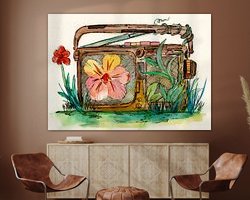 Illustration à l'aquarelle d'une radio portable cassée qui a été jetée quelque part dans la nature et qui est maintenant lentement envahie par les fleurs et les plantes.