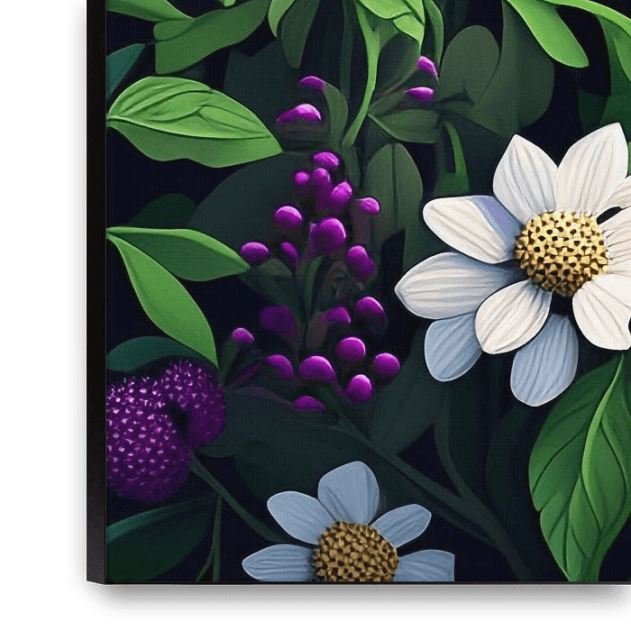 Cette illustration graphique riche en détails montre un groupe de fleurs forestières blanches entourées de feuilles vertes luxuriantes et de baies violettes éclatantes, le tout sur un fond sombre et profond. Le contraste élevé fait ressortir chaque élément botanique et donne aux fleurs et au feuillage un aspect presque tridimensionnel.…