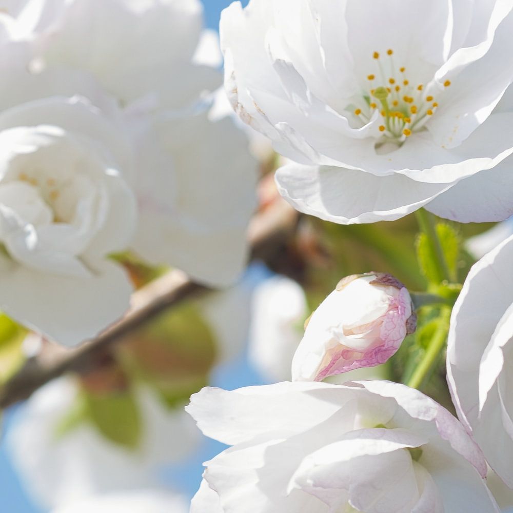 Derrière les fleurs blanches, le ciel est d'un bleu éclatant, ce qui correspond bien au printemps de ces fleurs. Elles ont besoin d'un peu de soleil, tout comme nous au printemps, ce qui nous rend heureux. Ces fleurs me rendent heureux quand je les vois.