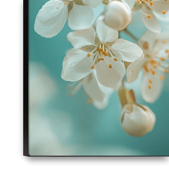 Cette magnifique photo montre une délicate branche fleurie avec des fleurs et des bourgeons blancs sur un fond bleu doux. Les fleurs ont des tons subtils de crème et de jaune, créant un aspect calme et harmonieux. Ce motif dégage une élégance naturelle qui s'intègre parfaitement dans les intérieurs modernes et minimalistes, mais qui…