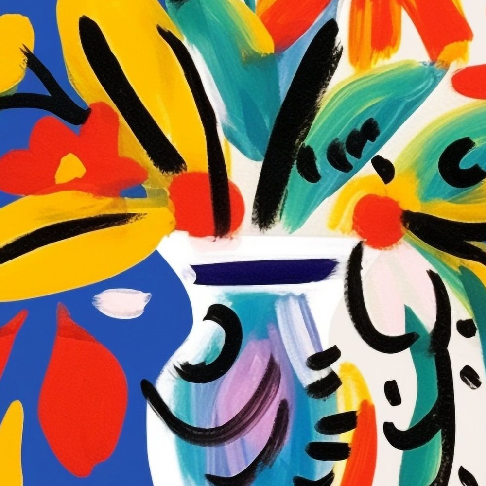 Image abstraite de fleurs dans un vase. La toile est divisée en une section bleu cobalt et une section blanche. Les fleurs contrastent magnifiquement grâce à l'utilisation primaire de la couleur. Conception simpliste avec de belles couleurs profondes et des accents de lignes sombres. Moderne. Convient à différents styles et tendances.