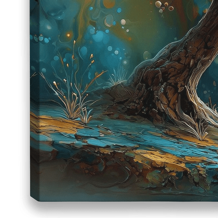 Cette peinture fantastique dépeint une scène enchanteresse d'un arbre à fleurs gracieux se penchant élégamment au-dessus d'une étendue d'eau scintillante. Ses branches sont richement décorées de fleurs blanches qui semblent briller de l'intérieur, baignées dans une lumière magique d'or, de turquoise et de bleu profond. L'arrière-plan…