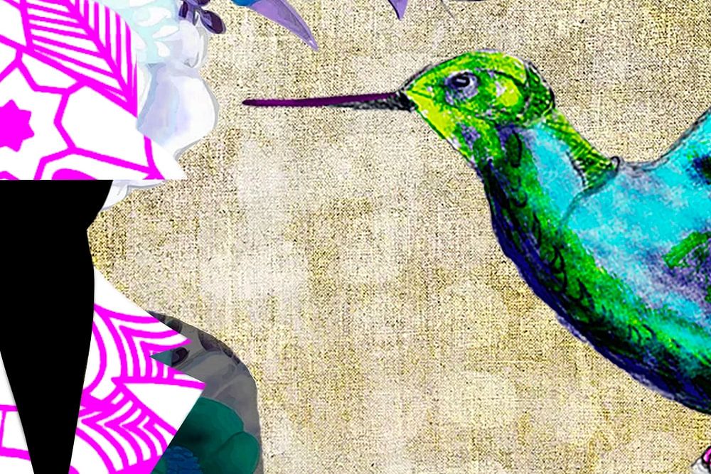 Un personnage sans visage portant un chapeau (de marmite) est mon inspiration. Autour de ce personnage, j'illustre des éléments colorés, comme le col de la veste dans la même impression que le chapeau. En arrière-plan, de belles fleurs colorées et un colibri coloré qui vole magnifiquement.