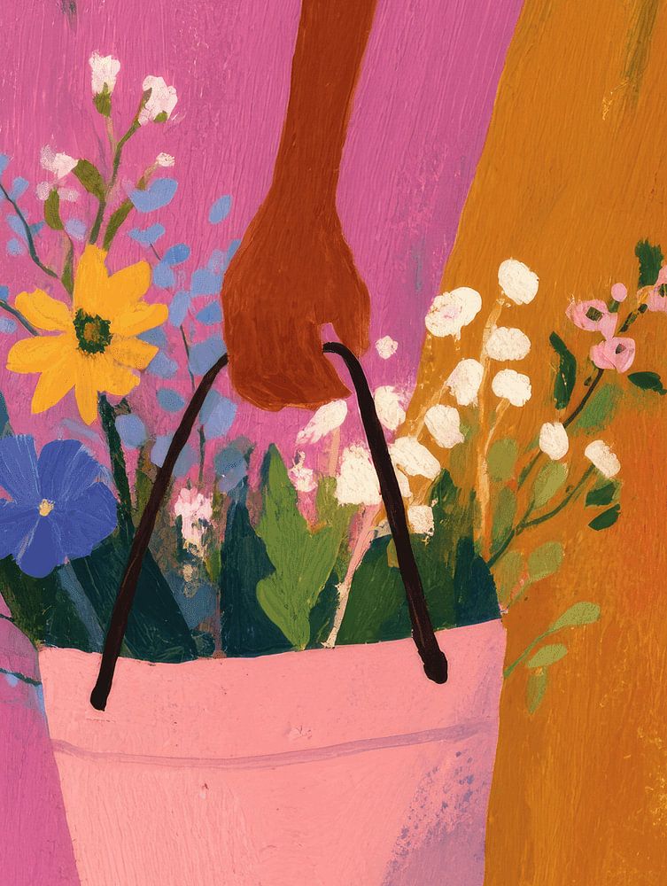 Une œuvre d'art ludique et colorée qui se concentre sur le moment quotidien d'une femme avec un panier de fleurs. Les tons vifs de rose, de jaune et de bleu se combinent harmonieusement avec les fleurs vibrantes, créant un aspect frais et optimiste. Le fragment minimaliste - seulement les jambes, la jupe et la main dans l'image - laisse place à l'imagination et fait de cette œuvre un accroche-regard moderne qui apporte gaieté et légèreté à n'importe quel intérieur.