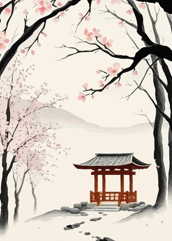 Une peinture sereine représente un chemin menant à un pavillon japonais traditionnel, entouré d'arbres aux délicates fleurs de cerisier roses. Les arbres sont représentés à l'encre noire, contrastant avec l'arrière-plan doux et pâle. Des pétales tombés sont éparpillés le long du chemin, ajoutant à l'atmosphère tranquille. Le pavillon est une structure simple avec un toit sombre et des supports rouges.