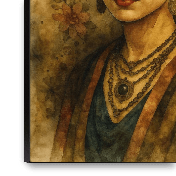 Un portrait de femme chaleureux et détaillé, orné de grandes fleurs de couleur rouge, crème et pêche. Des éléments décoratifs traditionnels et un tissu à motifs confèrent au motif une profondeur culturelle et un rayonnement intemporel. Les structures douces de l'aquarelle et les tons de fond terreux créent une atmosphère calme et…