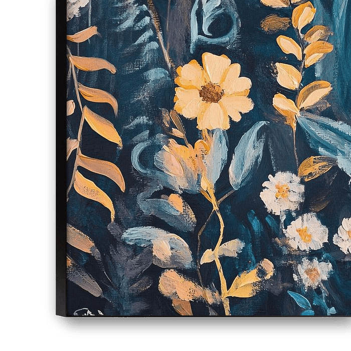 Détails : peinture de fleurs, peinture abstraite, art moderne, art floral, peinture de la flore, peinture de la nature, fleurs jaunes, fleurs roses, fond bleu foncé, art expressif