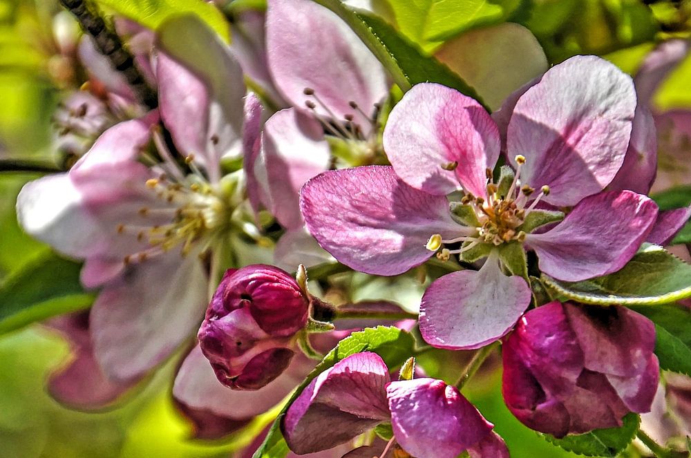 Les fleurs d'un pommier dans toutes les nuances entre le blanc, rose et rouge sur un fond vert floue presque abstraite.