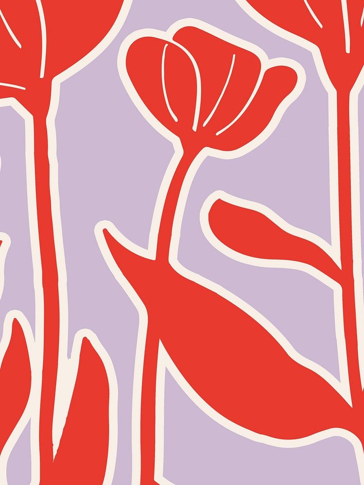 Des éléments floraux en rouge sur un fond lilas. Le style est certes minimaliste, mais avec une touche de couleur.