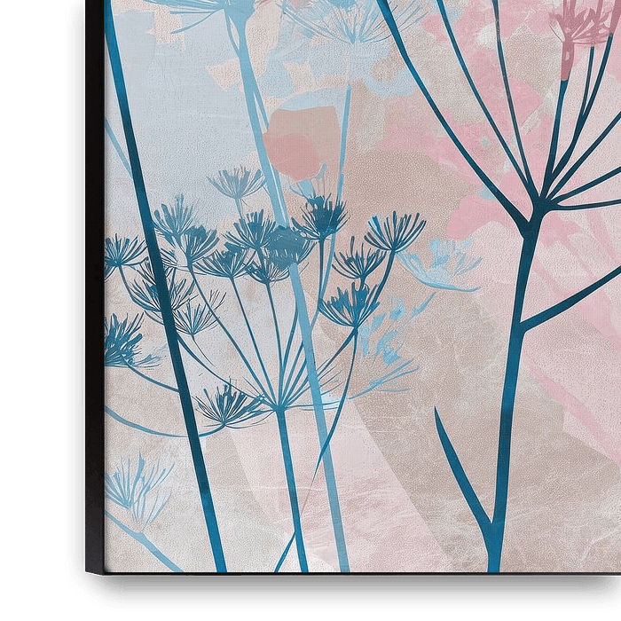 Cette œuvre d'art présente une composition élégante de fleurs délicates qui semblent flotter comme des silhouettes sur un fond doux et stratifié. La combinaison de tons bleu pastel, rose pâle et neutres clairs confère à l'œuvre une atmosphère paisible et onirique.