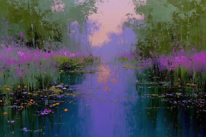 Wat je precies ziet: aan beide zijden van de vaart staan dicht opeengepakte rietstengels en een massa paarse en roze bloemen, opgebouwd uit korte, puntige penseelstreken en kleine vlekken verf — een soort hedendaags pointillisme dat van dichtbij bijna tactiel wordt. Op het water liggen kleine gele en oranje vlekken als waterlelies of zonvlekken; die werken als kleine accenten tegen het koele paars-blauwe vlak van de spiegeling. De compositie is symmetrisch genoeg om rust te geven, maar de textuur — dik opgelegde verf, paletmes-krassen en subtiele glazuren — houdt het spannend. Als je dit schilderij bloemen noemt, maak je geen afbreuk: bloemen en water bepalen hier het verhaal.