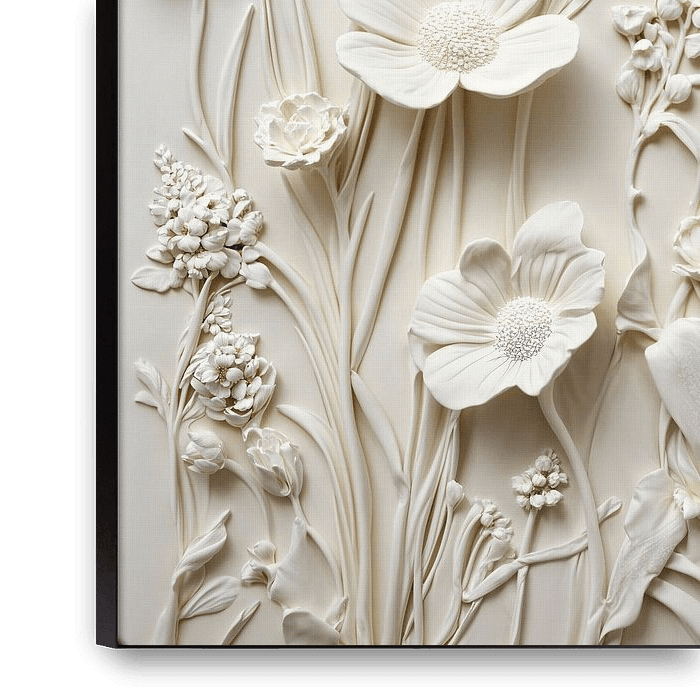 Ce magnifique motif présente un relief détaillé de fleurs et de plantes dans un style monochrome. La palette de couleurs douces et les textures subtiles rendent cette œuvre d'art parfaite pour toute pièce qui a besoin d'un look à la fois rustique et moderne. Qu'elle soit accrochée dans une chambre à coucher pour une atmosphère sereine…