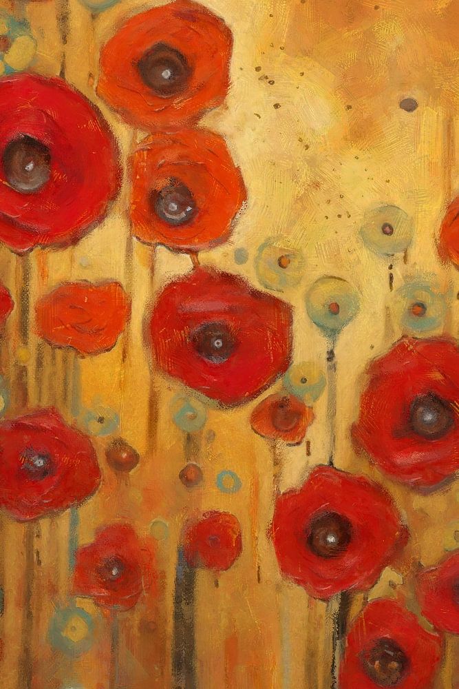 Cette œuvre montre un champ de fleurs rouges brillant dans la chaude lumière du matin. Les fleurs semblent danser sur un fond de teintes dorées et orangées, dégageant un sentiment de fraîcheur et d'énergie. La transition entre le bas plus sombre et le haut plus clair donne de la profondeur et du dynamisme à l'œuvre. L'ensemble de l'œuvre crée une atmosphère vibrante et stimulante, idéale pour un salon ou une cuisine, où elle ajoute une touche de nature et de dynamisme à l'espace.