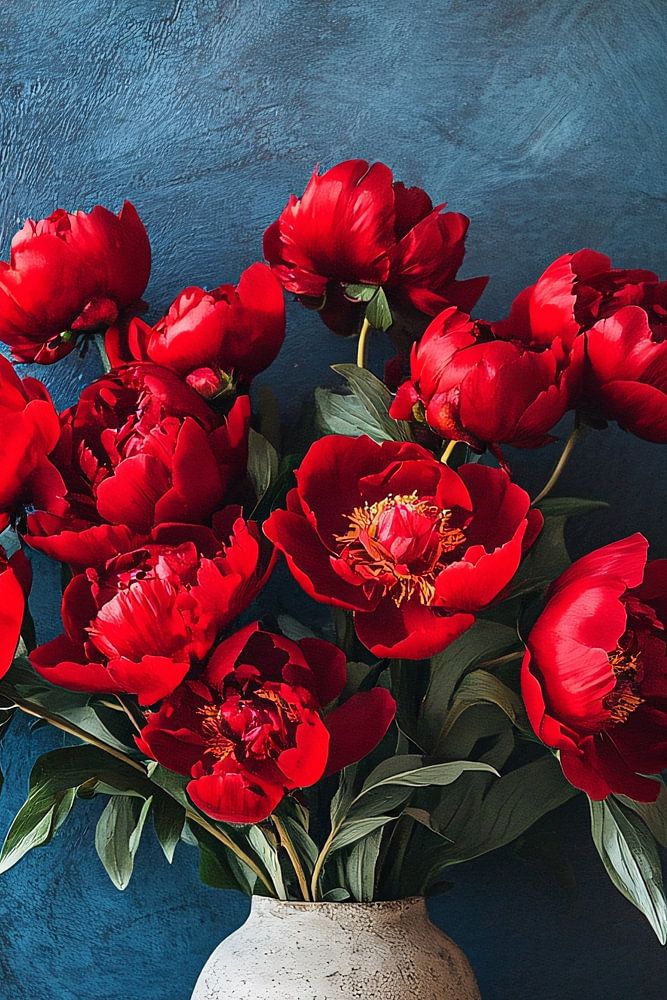 Ce magnifique motif associe un vase en pierre fait à la main à un bouquet de fleurs d'un rouge éclatant. Le fond bleu contrasté crée une sensation de luxe, faisant de cette nature morte un élément qui attire le regard dans n'importe quelle pièce. Parfaite pour les intérieurs qui veulent dégager une ambiance classique ou vintage. Un choix idéal pour les amateurs d'art intemporel.