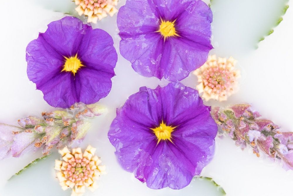 De belles fleurs dans un bain de lait et d'eau. Une composition mystérieuse.