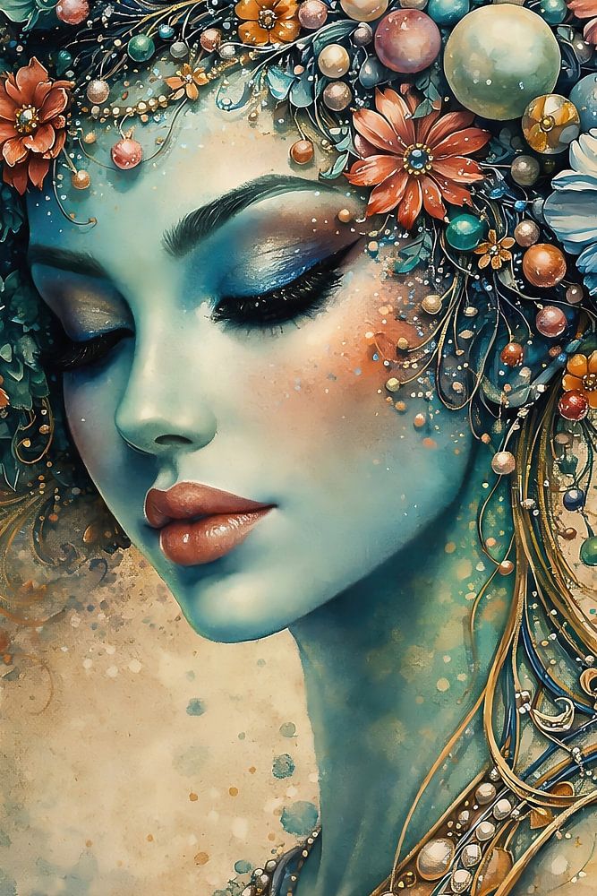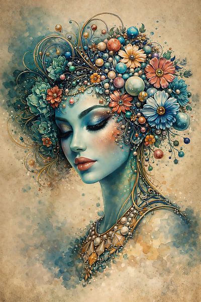 Inner Flowering montre une figure féminine silencieuse dans laquelle la nature et l'imagination se confondent. Sa peau semble se dissoudre dans de douces nuances de bleu et d'or, tandis que des fleurs, des formes nacrées et des lignes organiques jaillissent de son esprit comme autant de pensées. L'œuvre oscille entre vulnérabilité et…