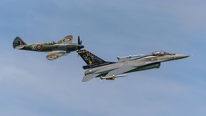 Achetez cette photo Flyby Supermarine Spitfire et General Dynamics F-16. par Jaap van den Berg sur toile, aluminium, ArtFrame ou photographie (encadrée), impression d'art en haute qualité et tout format.