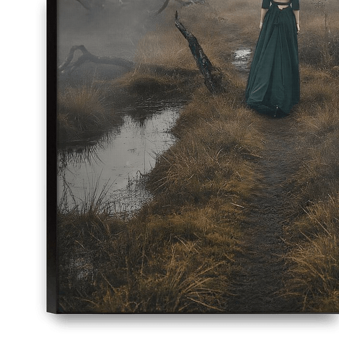 Plongez dans les forêts profondes et mystiques de la Forêt-Noire. Cette œuvre d'art surréaliste capture le silence d'une tourbière recouverte de brume, où la frontière entre la réalité et la légende s'estompe.