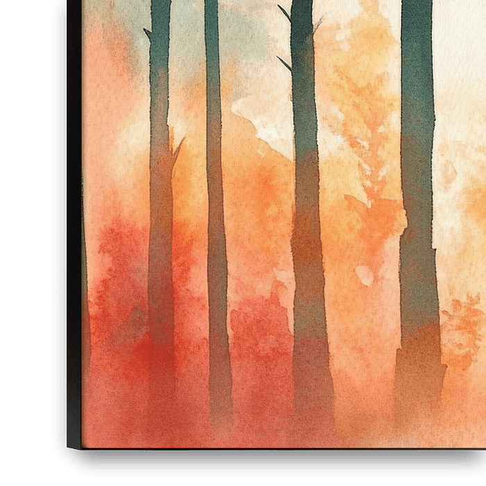 Une douce lumière traverse les grands arbres, tandis que l'orange chaud et le vert froid s'unissent harmonieusement. Ce paysage forestier de rêve respire la sérénité et invite à la rêverie. Idéal pour la chambre à coucher, il crée une atmosphère relaxante qui apaise les sens et invite à la détente.