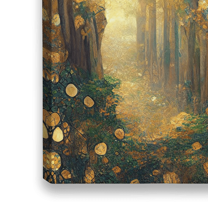 Une peinture numérique colorée d'une forêt de conte de fées dans le style de Gustav Klimt. Cette œuvre s'inspire des formes et de la palette de couleurs de "The Kiss". L'œuvre apporte une touche chaleureuse et classique à votre intérieur !
