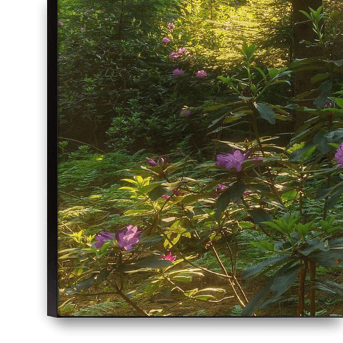Le soleil se couche dans une forêt fraîche de rhododendrons à fleurs violettes entre des troncs d'arbres droits.