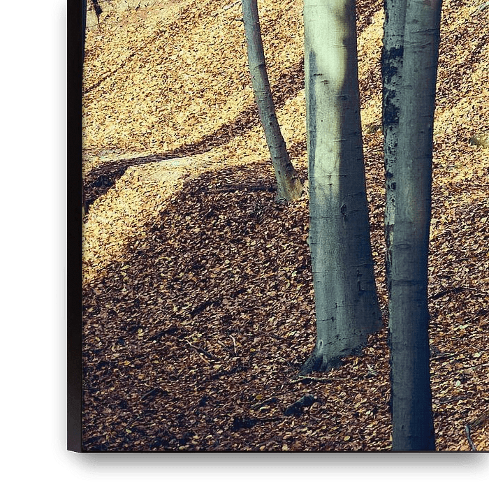 Vue sur une pente couverte de nombreux arbres à feuilles caduques. Les feuilles mortes recouvrent le sol et la lumière rasante crée un jeu d'ombres intéressant sur les troncs d'arbres.
