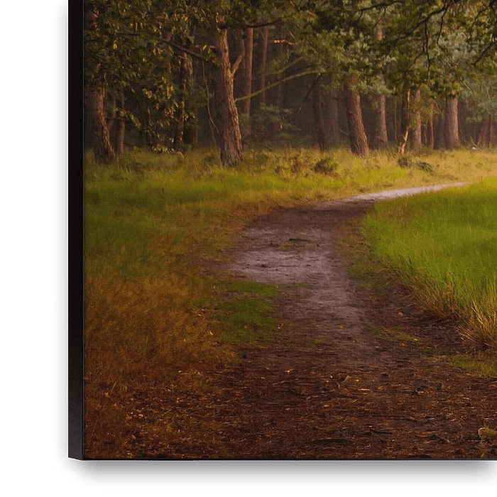 Cette photo de forêt et de bruyère a été prise sur la Groote Zand près de Hooghalen, un soir, juste avant le coucher du soleil. Au-dessus de la bruyère pourpre, le brouillard s'élève. Un sentier forestier serpente sous les arbres.