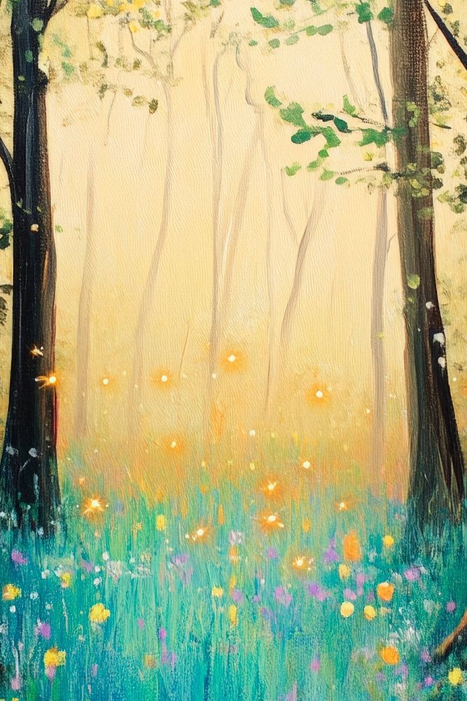 Une forêt de rêve, pleine de lucioles lumineuses et de couleurs douces, invite à s'attarder. L'atmosphère douce et les fleurs épanouies créent un sentiment harmonieux de paix et de magie. Cette œuvre d'art est parfaite pour la chambre à coucher, où elle crée une ambiance apaisante et romantique.
