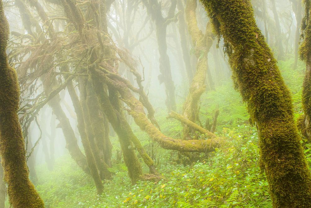 Forêt tropicale de lauriers sur l'île de La Gomera. La photo montre des lauriers roses de forme capricieuse dans la forêt tropicale brumeuse. Les arbres sont couverts de mousse verte.