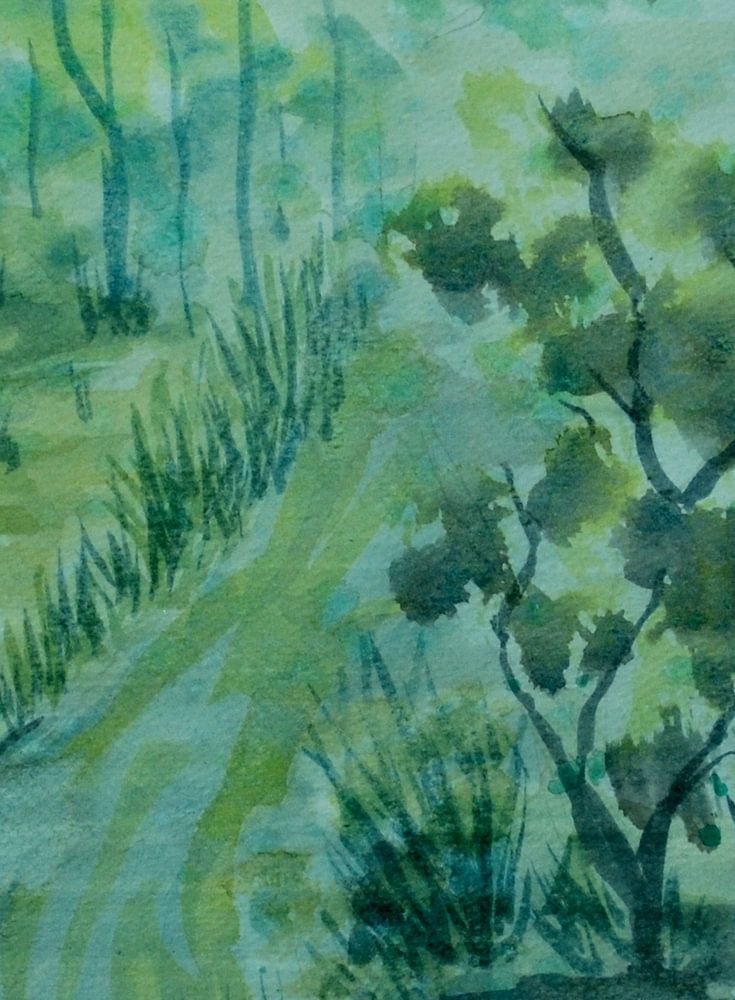 Peinture traditionnelle à l'aquarelle d'un paysage forestier à l'aspect lugubre dans des aquarelles vertes.