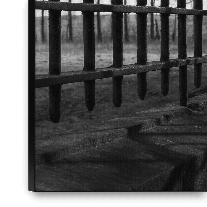 Cette photo montre une partie du travail de fer forgé autour d'une ancienne Kappel. Ce qui rend cette photo unique, c'est qu'un arbre est visible au loin entre chaque treillis. La photo est éditée en noir et blanc.