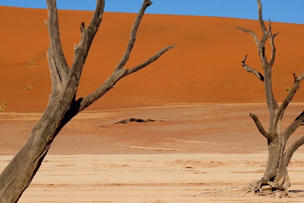 Dans ce fragment de Deadvlei, deux arbres se dressent comme des personnages sur scène : deux danseurs, à la fois miroirs et uniques.