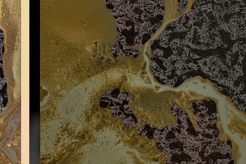 Une terre enclavée entre des continents flottants ? Ça pourrait l'être. Le spectateur a la liberté de traduire cette abstraction en une image reconnaissable pour lui, et c'est précisément ce qui la rend si intéressante. Pour moi, l'art consiste à naviguer entre une multitude de matériaux formels et de couleurs pour obtenir un résultat qui me convienne. L'image est composée de nombreuses couches photographiques qui, lorsqu'elles sont traitées, ont toujours un effet variable les unes sur les autres et, après un certain temps, atteignent le bon moment où je décide de m'arrêter.