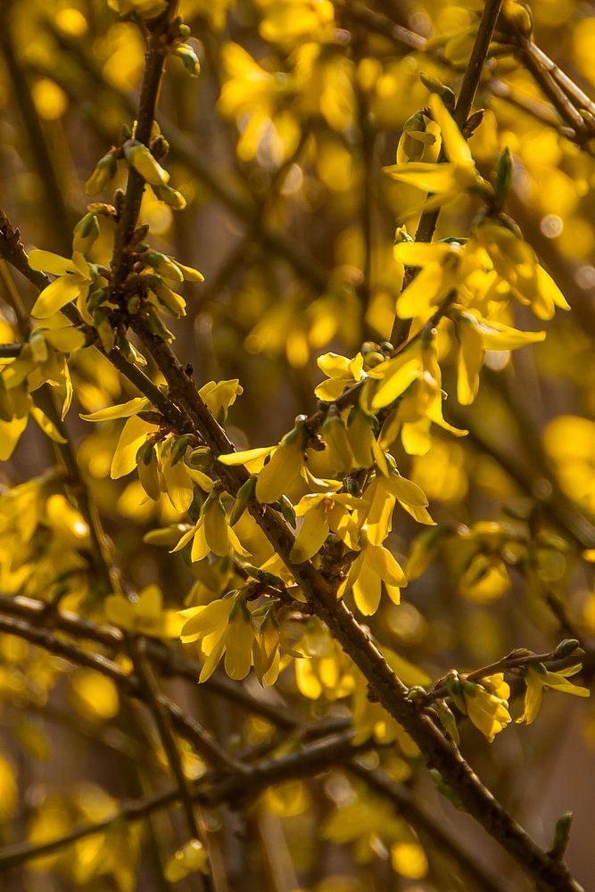 Un forsythia dans le jardin avec des fleurs jaune d'or