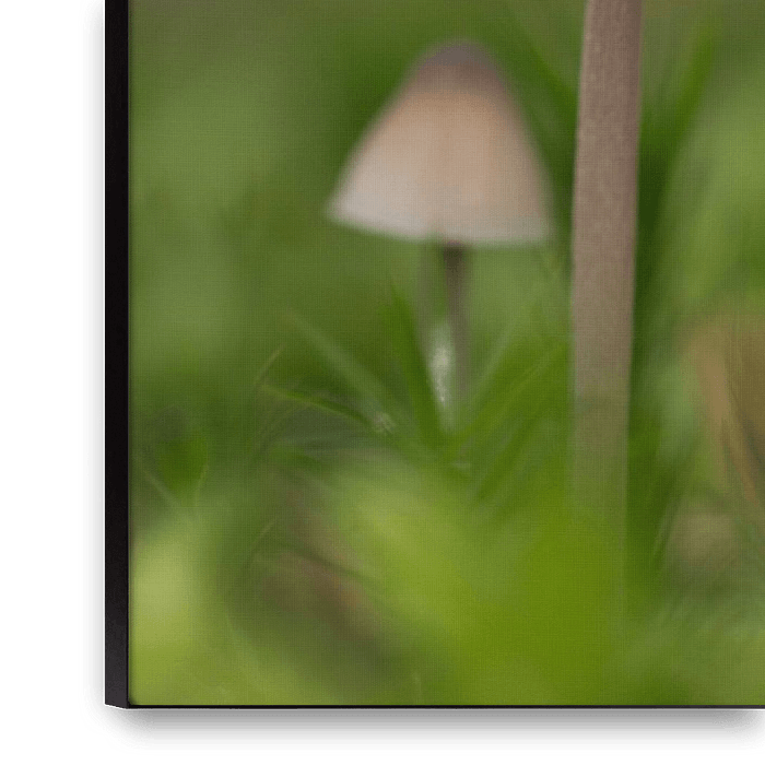 Achetez cette photo Forts ensemble - Deux petits champignons beiges dans le vert par Dagmar Hijmans sur toile, aluminium, ArtFrame ou photographie (encadrée), impression d'art en haute qualité et tout format.