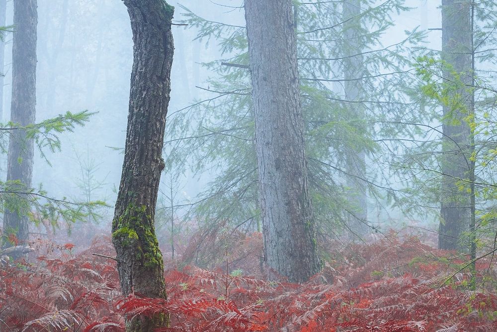 Fougères dans la brume | Photo de forêt | Veluwe par Marijn Alons