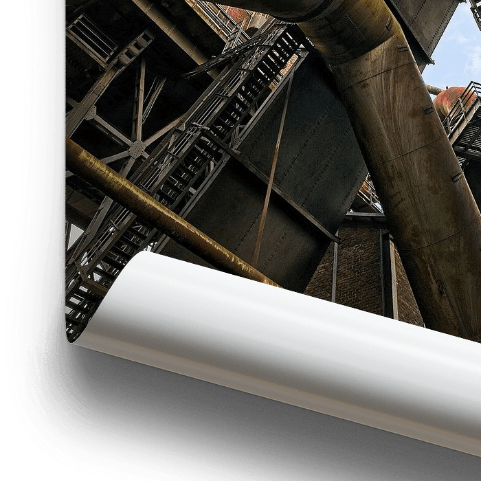 Vue vers le haut de l'ancien haut-fourneau de plusieurs dizaines de mètres de haut dans le Landschaftspark de la ville allemande de Duisbourg.