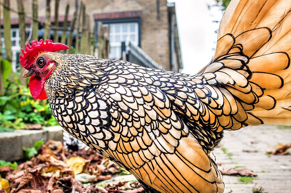 Fraai gekleurde en getekende haan verdedigde zijn kippen in een straatje in Poppenwier, Friesland, en was niet onder de indruk van de fotograaf.