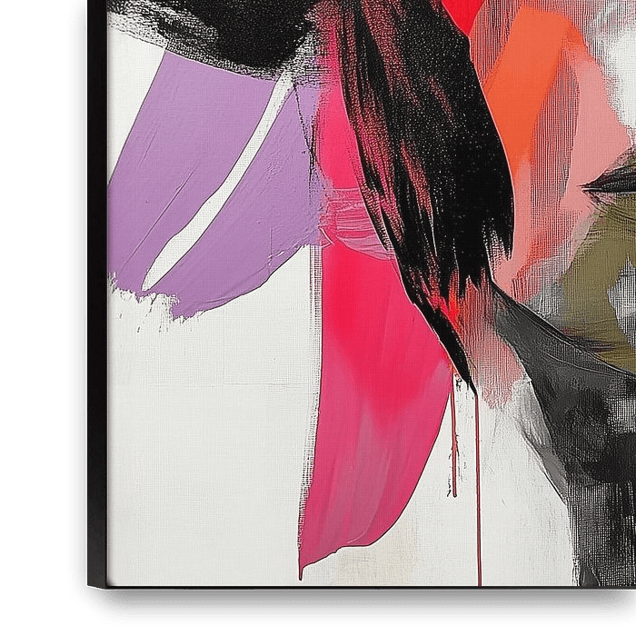 Cette peinture est un portrait puissant et expressif qui fusionne l'art abstrait et l'art figuratif. L'image montre le visage d'une femme, rendu en partie de manière réaliste en noir et blanc et en partie entrelacé de coups de pinceau dynamiques en rouge, orange, rose et violet. Les contrastes entre les yeux nets et détaillés et les…