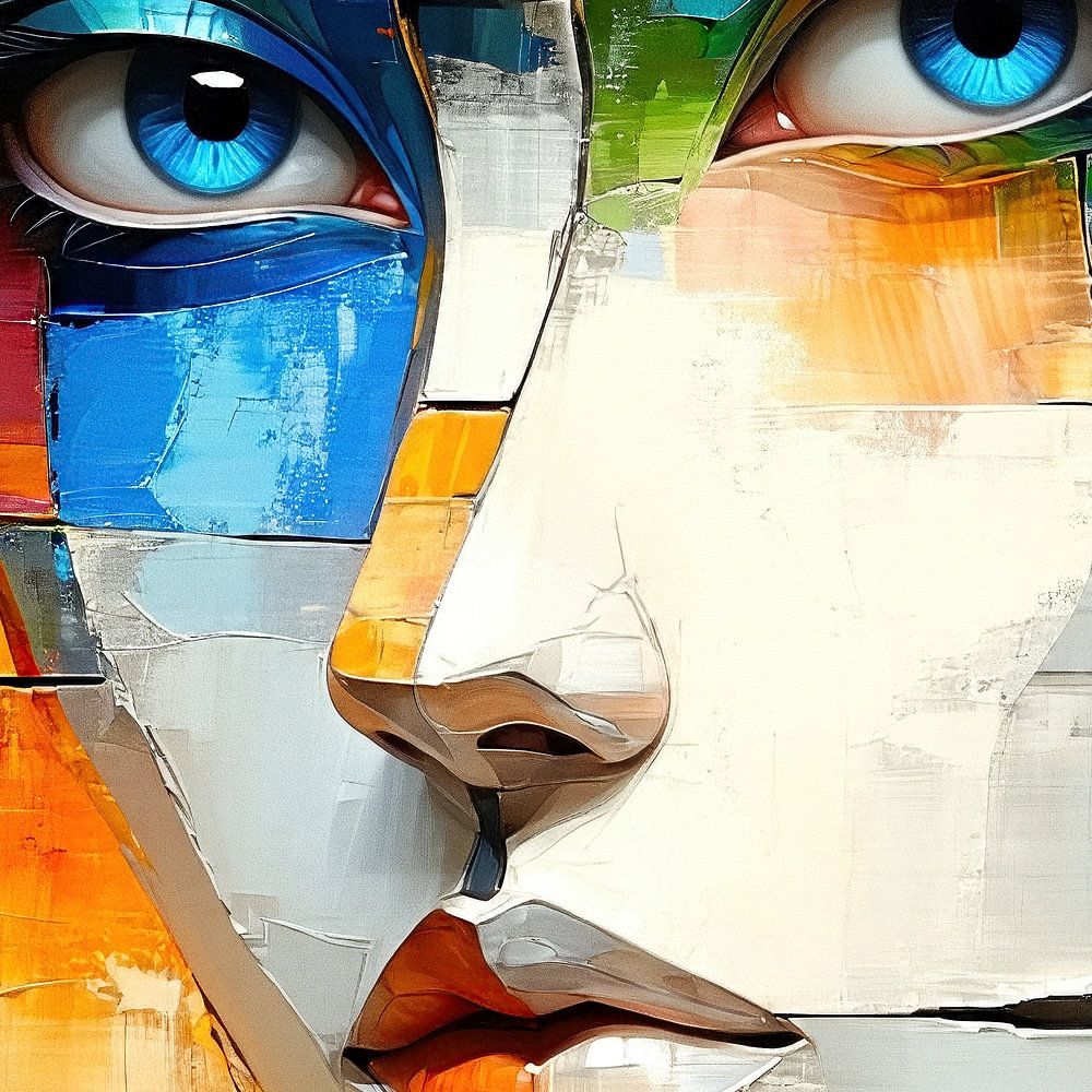 Cette œuvre artistiquement conçue, à la manière d'une peinture abstraite, capture la tête d'une femme de profil, mais son regard ne se pose pas au loin - il semble pénétrer directement le spectateur, comme si elle pouvait voir dans les profondeurs de l'âme. Son visage n'est pas représenté avec une perfection classique, mais semble être composé d'innombrables fragments, comme s'il se formait à partir des fragments d'un monde onirique surréaliste.