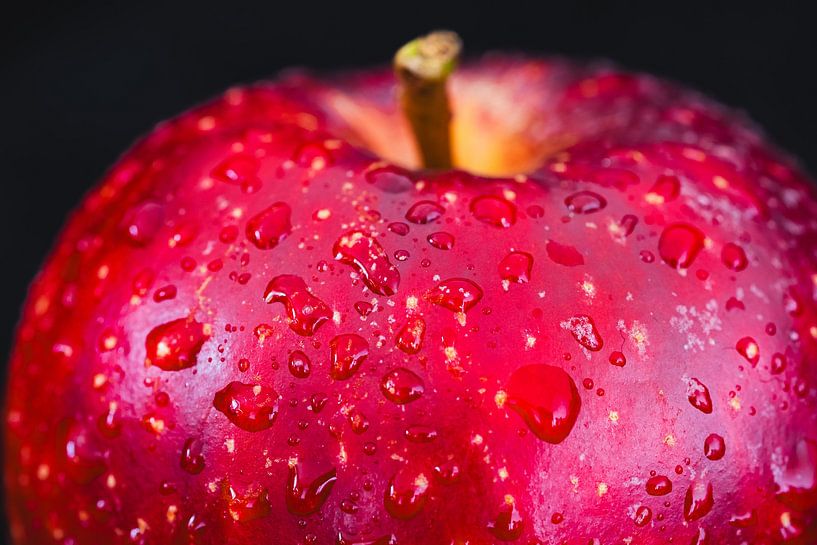 Gros plan sur une pomme rouge, photographiée juste après avoir été lavée. La peau brille d'un rouge profond, presque velouté, tandis que des dizaines de gouttes d'eau s'accrochent à la surface. Chaque goutte capte la lumière à sa manière, certaines sont rondes et lisses, d'autres irrégulières et plus lourdes, comme de petits accents dans l'image.