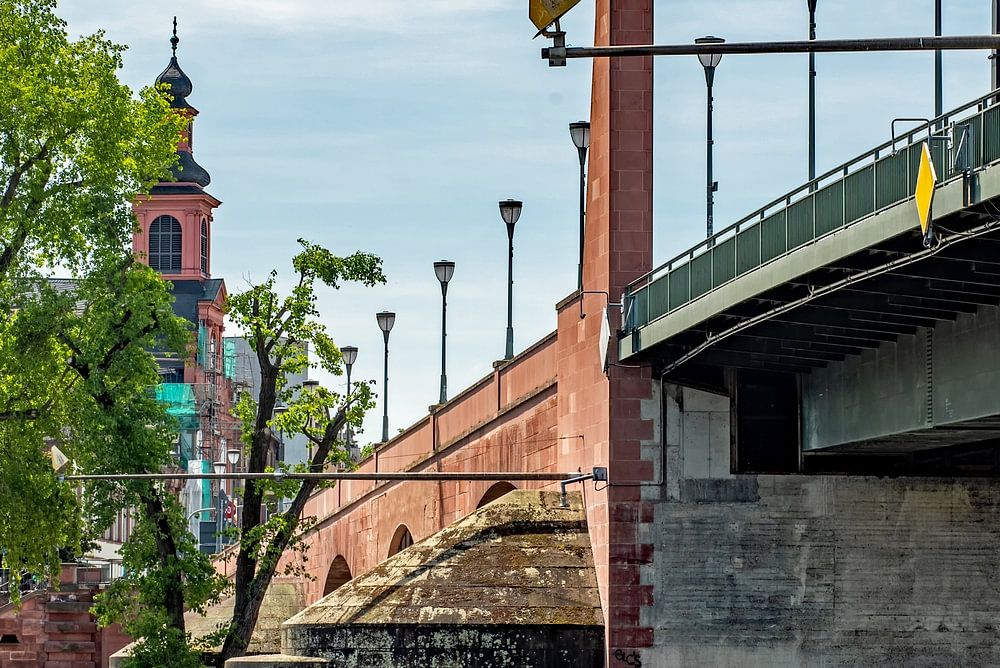 Vue partielle du Vieux Pont sur le Main en direction de Sachsenhausen.Le Vieux Pont de Francfort-sur-le-Main est le plus ancien et était jusqu'au milieu du 19e siècle le seul pont en pierre sur le cours inférieur du Main. Du Moyen-Âge jusqu'en 1914, il reliait la Fahrgasse dans la vieille ville de Francfort à la Brückenstraße à Sachsenhausen. Depuis qu'il a été mentionné pour la première fois dans un document en 1222, le développement de Francfort a été indissociable de ce pont. Au cours des siècles, elle a été détruite et reconstruite au moins 18 fois. Avec ses 13 arcs en plein cintre maçonnés, le pont de Sachsenhausen était considéré comme l'ouvrage le plus important de la ville. Comme il n'était plus adapté aux exigences du trafic routier et fluvial moderne, il a été démoli en 1914. L'actuel Vieux Pont, plus correctement appelé Nouveau Vieux Pont, a été inauguré le 15 août 1926 par le maire de l'époque, Ludwig Landmann. Deux de ses huit arches revêtues de grès rouge du Main furent dynamitées le 26 mars 1945 par des soldats allemands. Après une reconstruction d'abord provisoire, la partie centrale fut remplacée par un pont en caisson en acier et mise en service le 15 septembre 1965. En 2006, le Vieux Pont a été doté d'un nouveau bâtiment, le Nouveau Portique, qui rappelle l'ancien moulin du pont. L'aspect actuel du pont, marqué par quatre portiques de part et d'autre de la partie centrale, a été obtenu lors de la rénovation de 2014. Le symbole du Vieux Pont est le Brickegickel et la statue du fondateur mythique de la ville, Charlemagne.