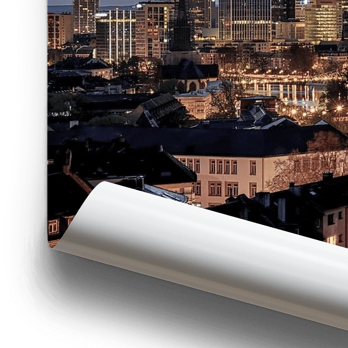 Le ciel bleu du soir contraste très bien avec les lumières chaudes de la ville. La skyline reconnaissable du quartier des banques est tout aussi présente que le Main, qui coule tranquillement à travers l'image et reflète les couleurs du ciel.
