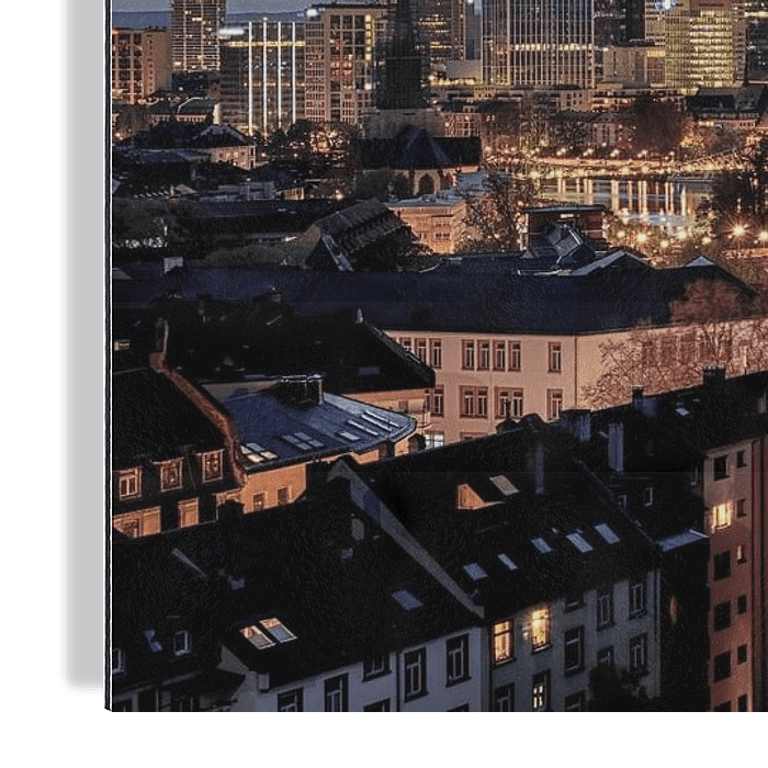 Le ciel bleu du soir contraste très bien avec les lumières chaudes de la ville. La skyline reconnaissable du quartier des banques est tout aussi présente que le Main, qui coule tranquillement à travers l'image et reflète les couleurs du ciel.