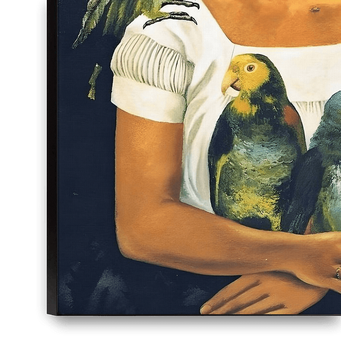 Comme souvent, Frida s'est peinte avec ses animaux bien-aimés. Les perroquets ne sont pas de simples accessoires, mais des êtres avec lesquels elle se sent profondément liée. À l'époque où elle réalise ce portrait, elle vient de se remarier avec Diego, mais son cœur bat ailleurs : elle vit une liaison passionnée avec Nickolas, un photographe portraitiste de talent qui non seulement l'aime, mais l'aide à réaliser sa toute première exposition personnelle à New York en 1938. Ils se sont rencontrés au Mexique, un pays plein de couleurs, d'amour et de contrastes, à l'image de ses peintures.