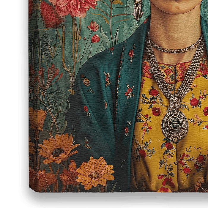 Portrait de Frida, fond floral coloré, tons de turquoise et de jaune, beau visage, fleurs dans les cheveux, elle porte un collier en or autour du cou, fleurs sur le sol.