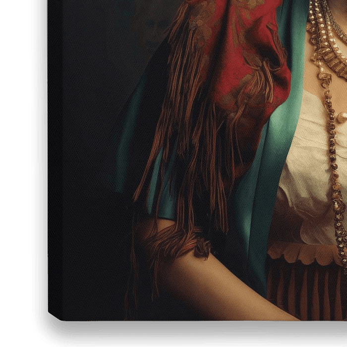 Belle image ancienne de l'artiste Frida. Des fleurs colorées dans ses cheveux et un fond vert profond créent un look subtil. Jolis colliers et chemisier en soie. Convient à une variété de styles et de tendances.
