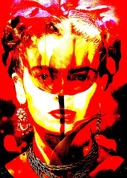 L'image montre un portrait très stylisé et intensément retravaillé de Frida, réalisé dans un style visuel très contrasté, presque semblable à une affiche. La palette de couleurs est dominée par des tons vifs de rouge, de jaune et de noir, ce qui confère à l'ensemble un aspect dramatique et presque surréaliste. Les yeux et le nez de…
